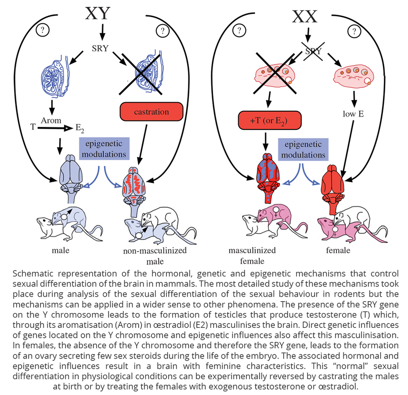 Ce sont des manipulations épigénétiques qui permettent à Jacques Balthazart d’obtenir des « souris mâles féminisées (des souris mâles passives) et des « souris femelles masculinisées » (des souris femelles actives). Comme l’explique ce joli dessin: